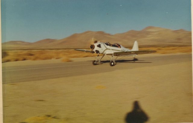 The sometimes fierce desert winds have caused more "accidents" than resulted from the actions of pilots. This sailplane and what appears to be a military surplus T-50 "Bamboo Bomber" met unexpectedly. In the background are the two military-surplus wood buildings which graced the FBO lot in early years.